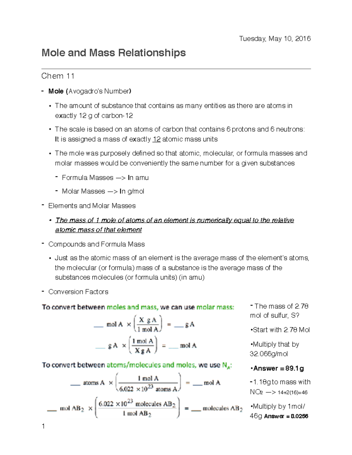 Mole and Mass Relationships - Tuesday, May 10, 2016 Mole and Mass