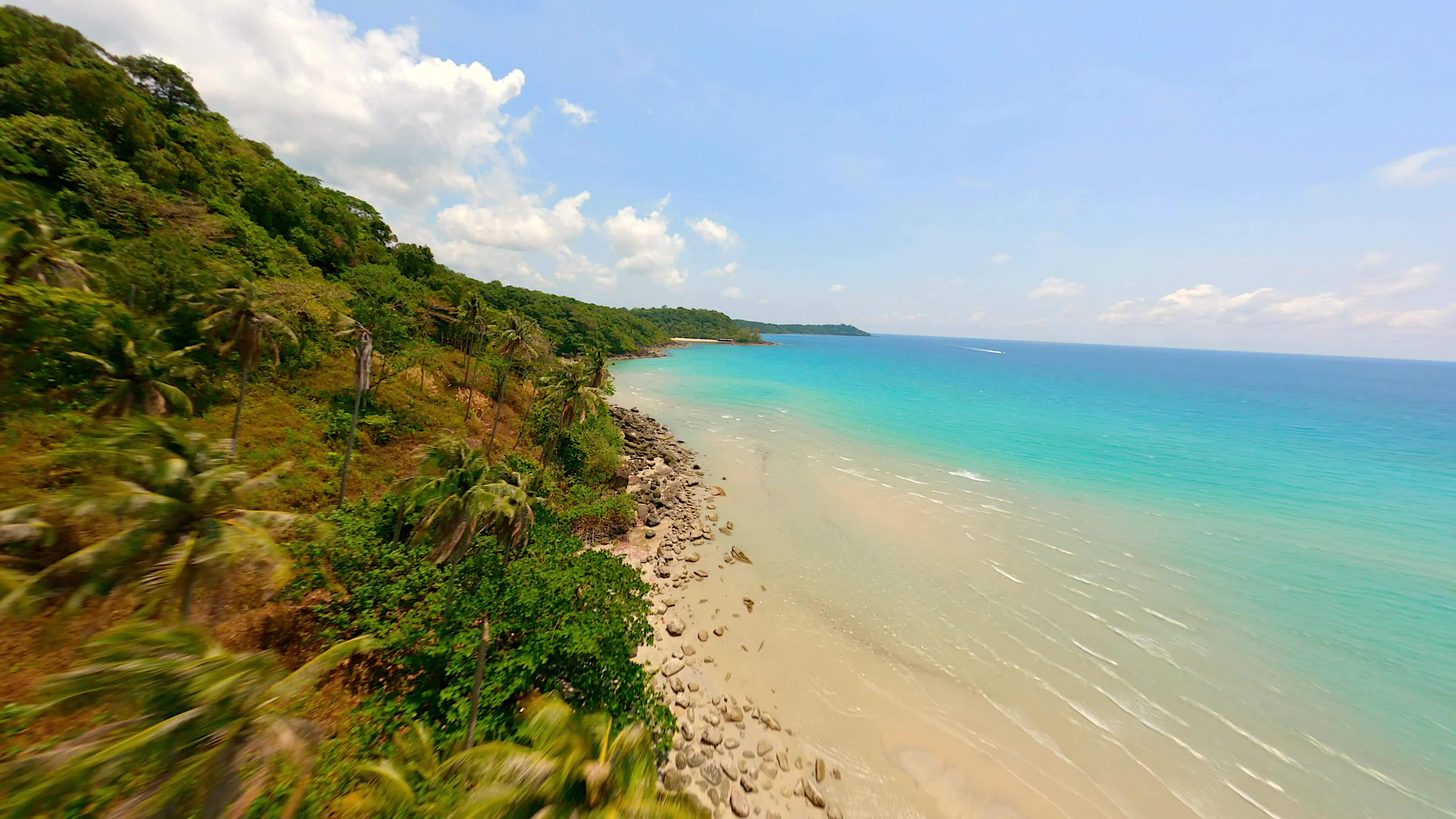 Cinematic FPV drone flight over tropical beach on paradise island in