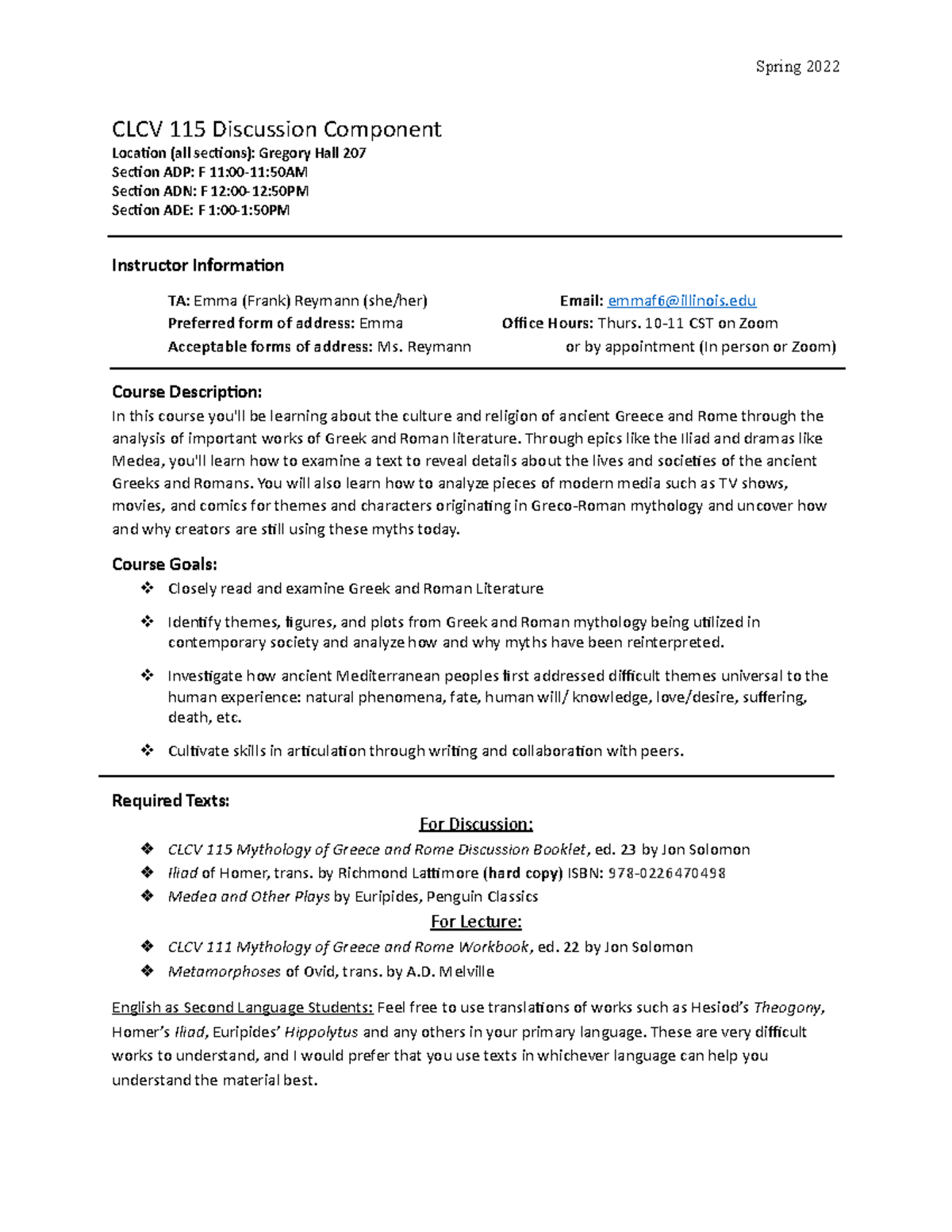 CLCV 115 SP22 Syllabus - Spring 2022 CLCV 115 Discussion Component