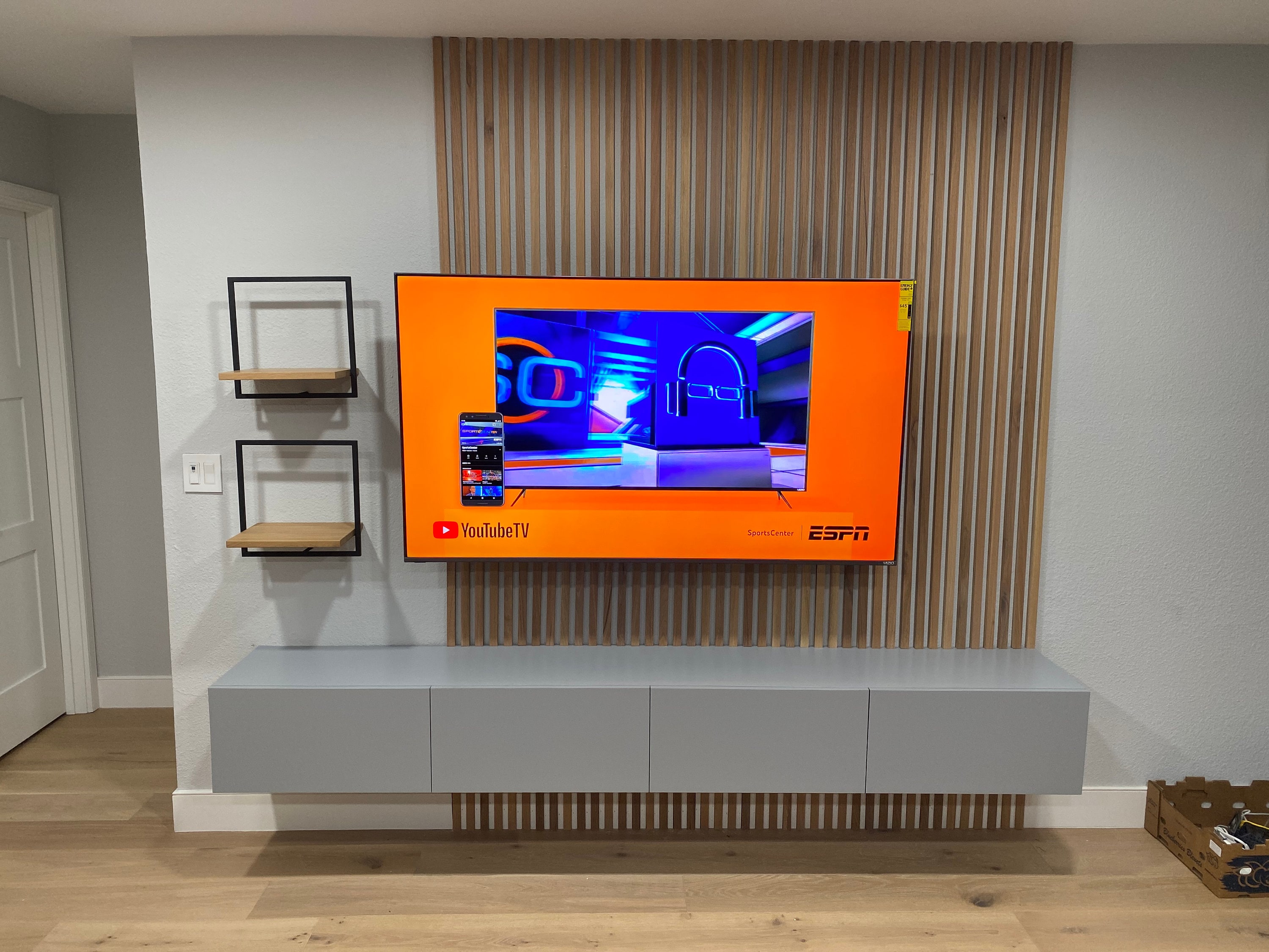 Generally, a floating media console should be about 6 inches wider than your tv for visual balance.