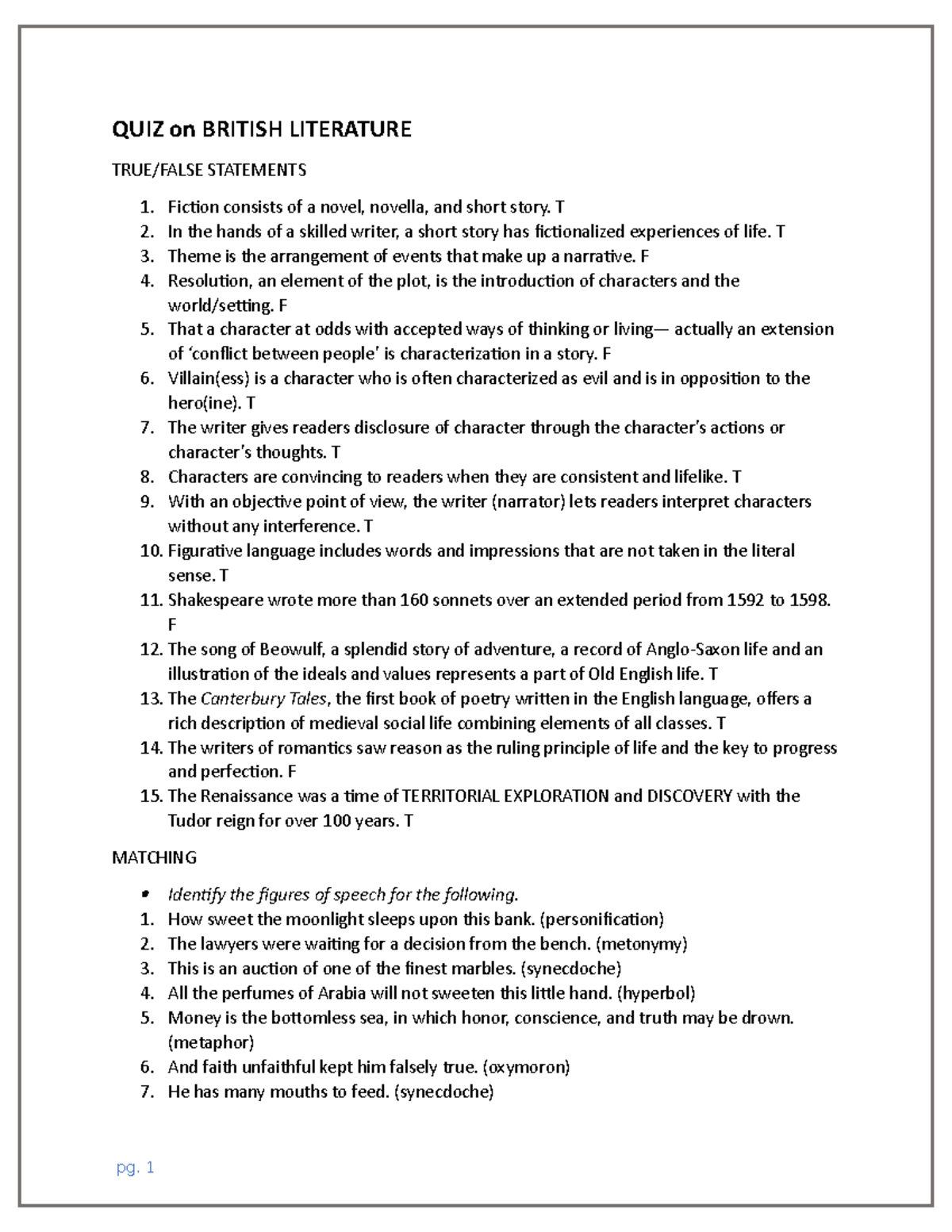 KEY-QUIZ on British Literature 2022-2023 - QUIZ on BRITISH LITERATURE of Identify The True And False Statements About Herbert Blumer . Source: www.studocu.com