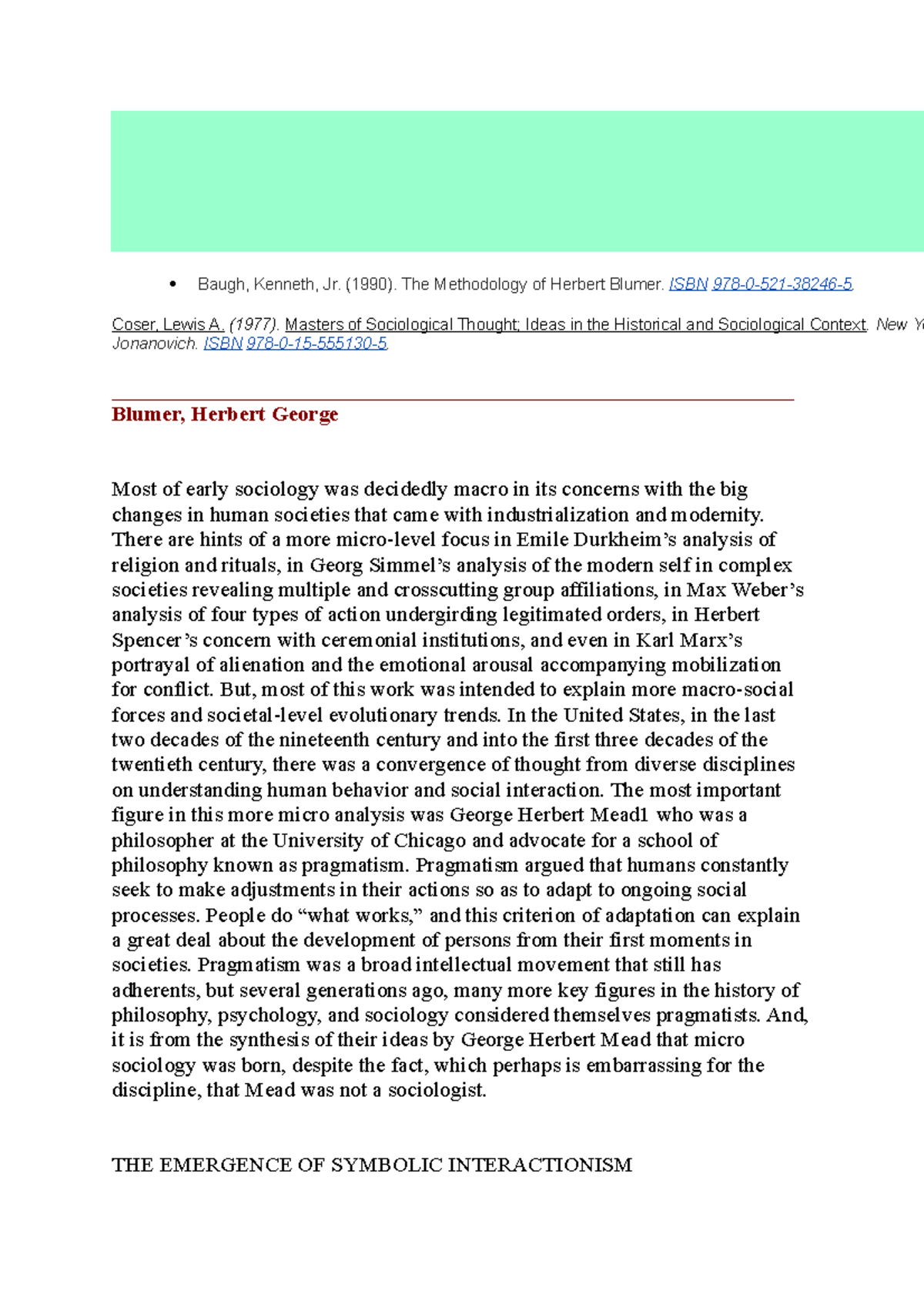 Blumer -. - Baugh, Kenneth, Jr. (1990). The Methodology of Herbert