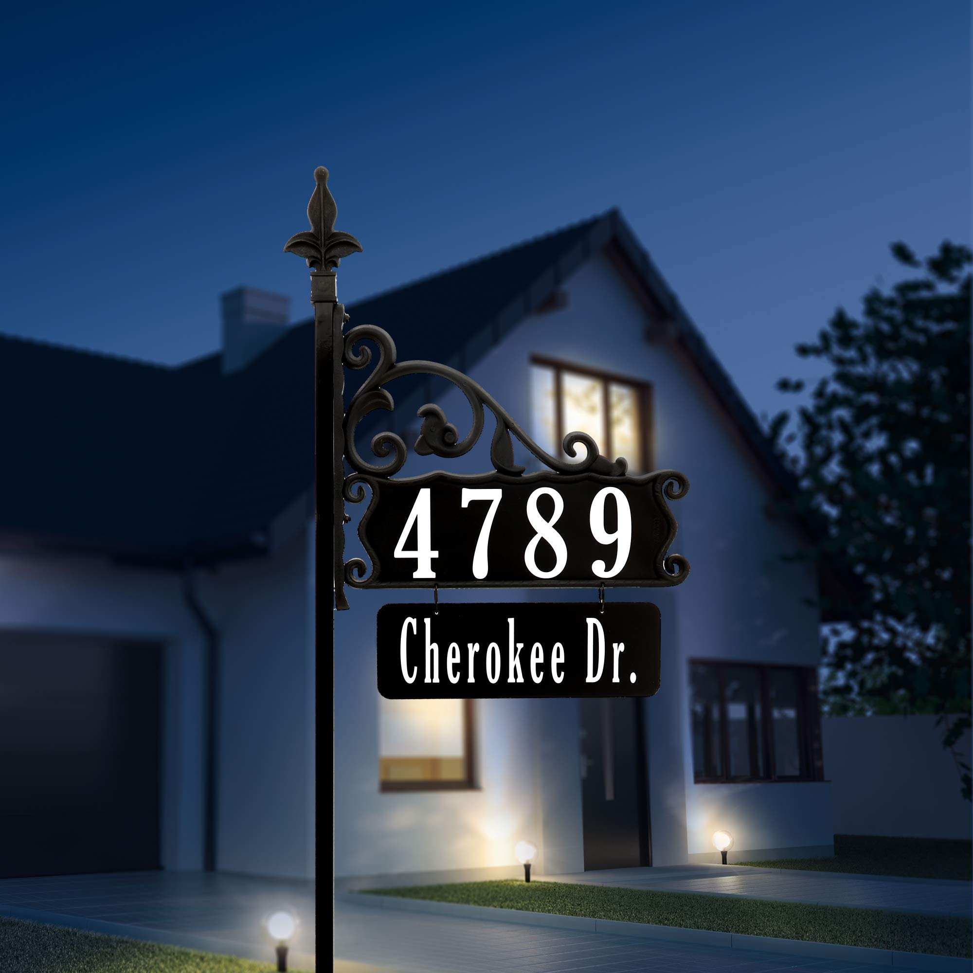 This address sign features traditional styling and a simulated.
