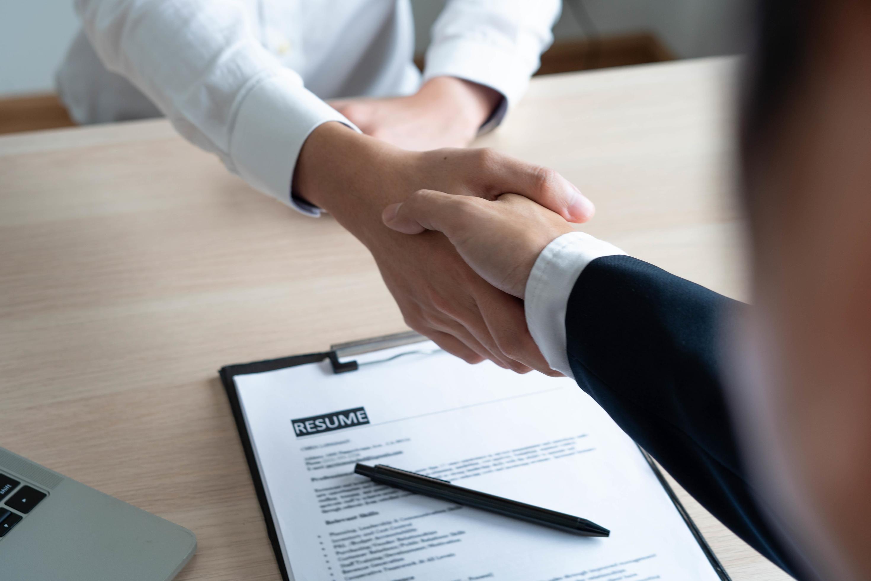 Businessmen and job seekers shake hands after agreeing to accept a job