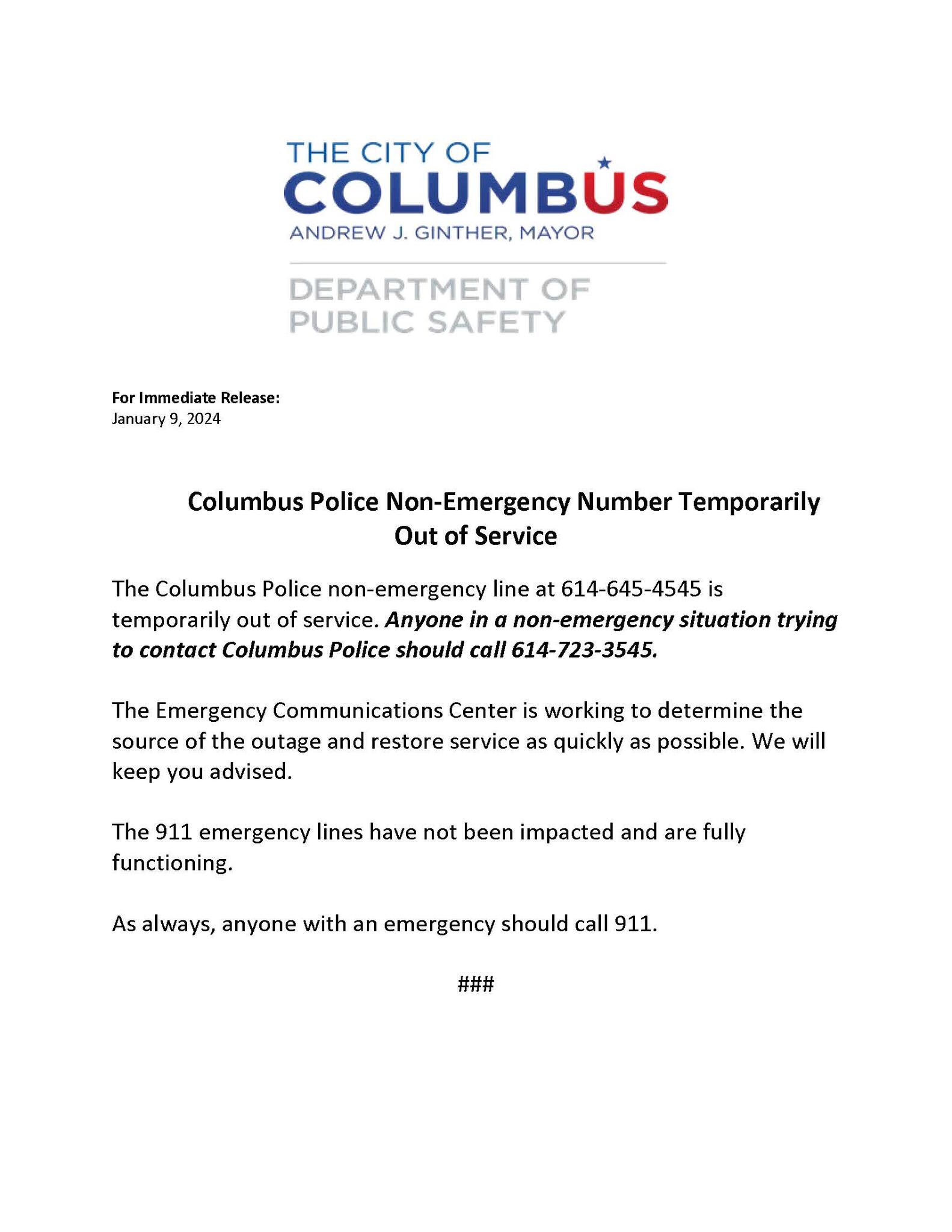 The Columbus Police non-emergency line is temporarily out of service