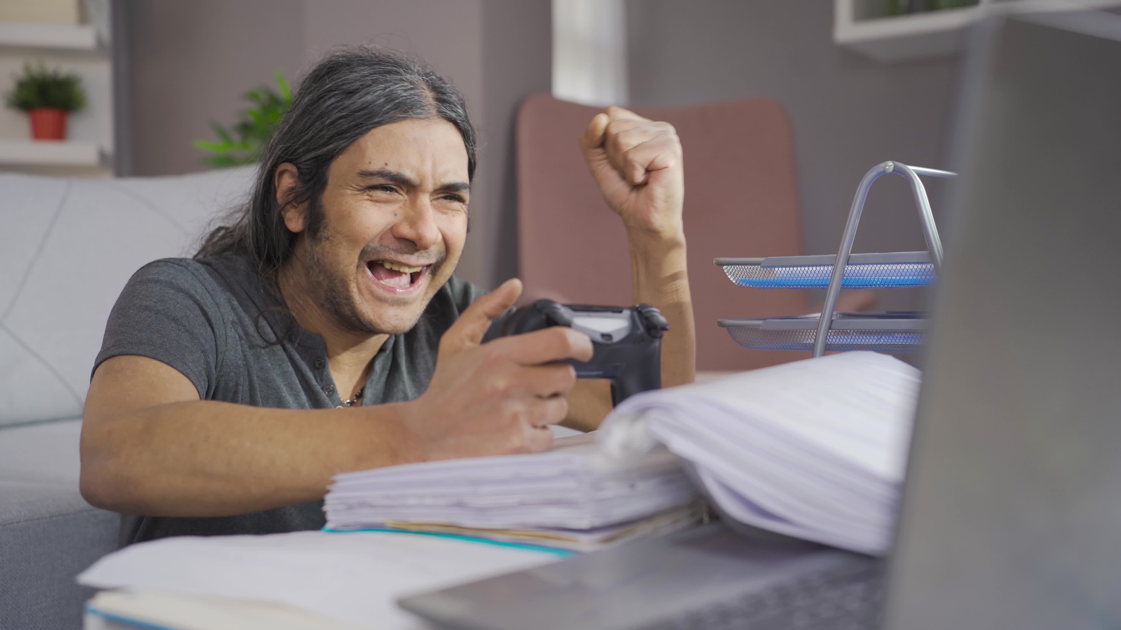 Lazy man with distraction. Man working at home is distracted and quits
